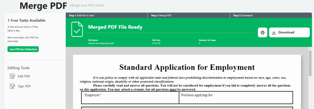 Once you’re done, select Merge PDF. You will then be able to download or print your merged document!