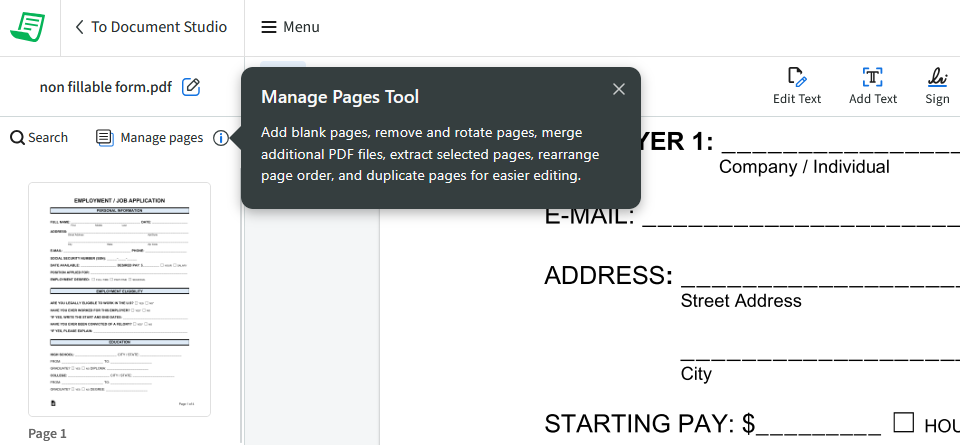 2. On the left-hand side of PDF.Live, click the Manage Pages button.