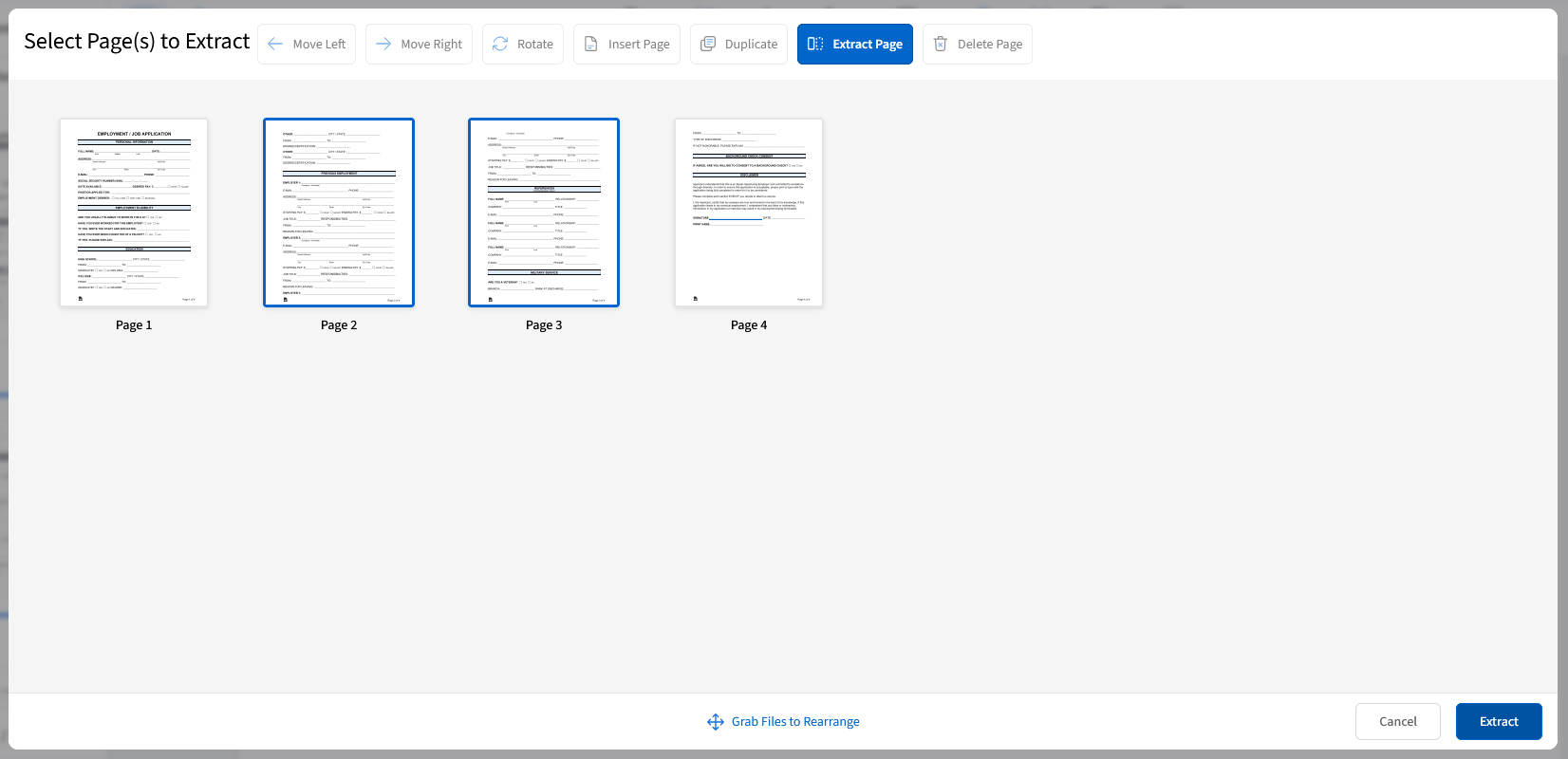 1. Click Extract Page and then click the pages that you’d like to unmerge from your document. Once you’ve selected them you can then click Extract to download a PDF with just those pages in it.